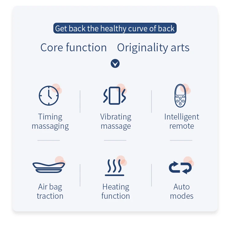 • Relieve Lumbar Spine: When a person lies flat on the lumbar traction device, the device dynamically expands and contracts through the air bag, and the lumbar spine falls together rhythmically, relieving waist pain and relaxing. Multi-frequency vibration lumbar massage uses vibrations of different frequencies to activate muscles and release waist pressure.
